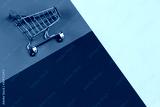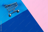 Mini shopping trolley cart on pastel pink, light blue and navy color background. Online shopping, buy, sale, discount concept