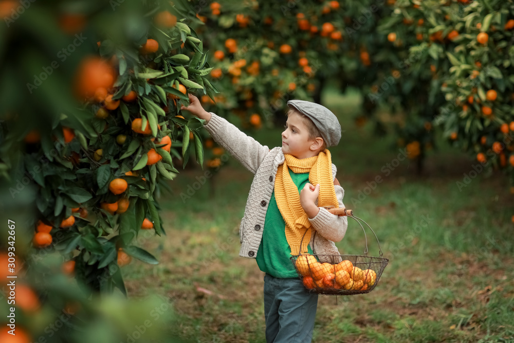 A boy in a garden with fruit trees in a hat and a yellow scarf on his chest.