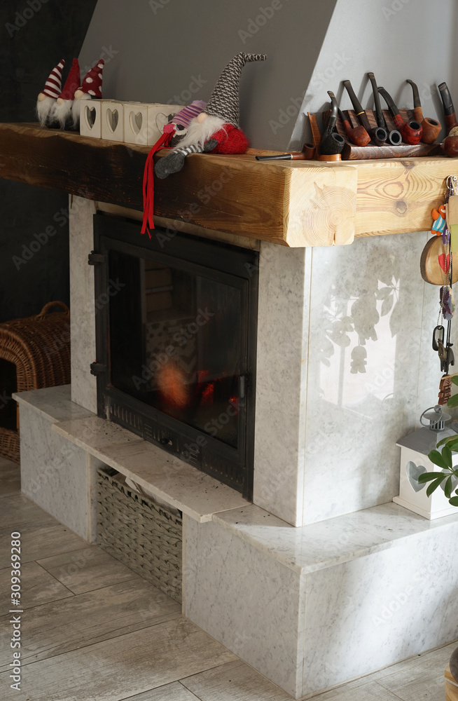 marble fireplace with a wooden beam decorated with Christmas decorations