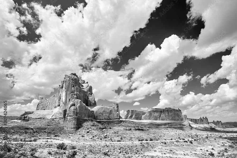 Black and white picture of rock formations in Arches National Park, Utah, USA.