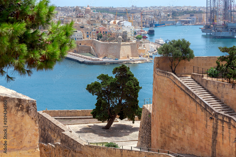 Malta. Aerial view of the old town and the bay on a sunny morning.
