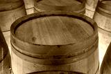 Wooden barrels stand on top of each other, wine storage, part of the interior, the structure of the tree.