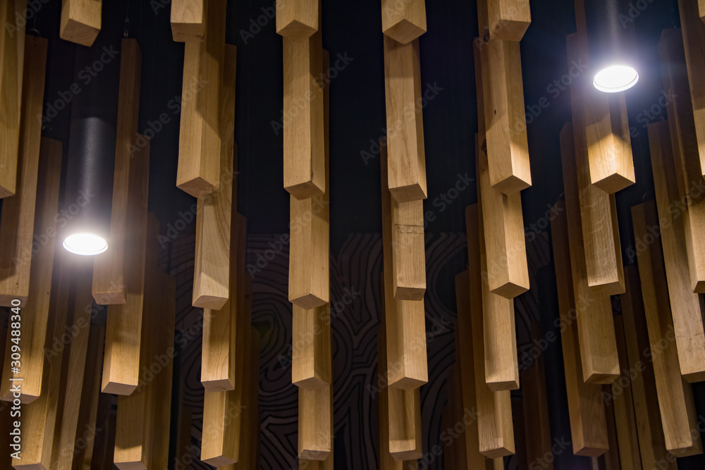 Wooden bars hang from the top, decorative decoration of the ceiling in the room