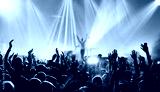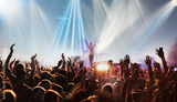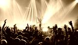 crowd with raised hands at concert festival banner