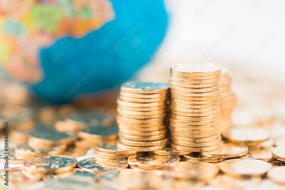 Stacks of gold COINS, a globe, and a silver key lay together.