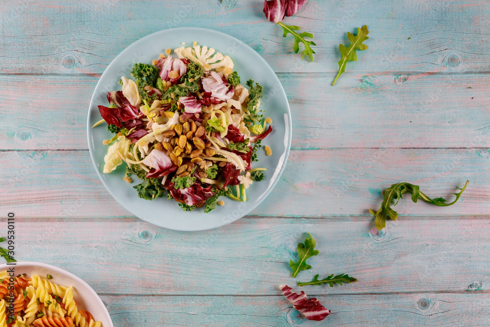 Fresh salad mix with arugula, cauliflower, kale and pistachios on wooden background. Vegetarian food.