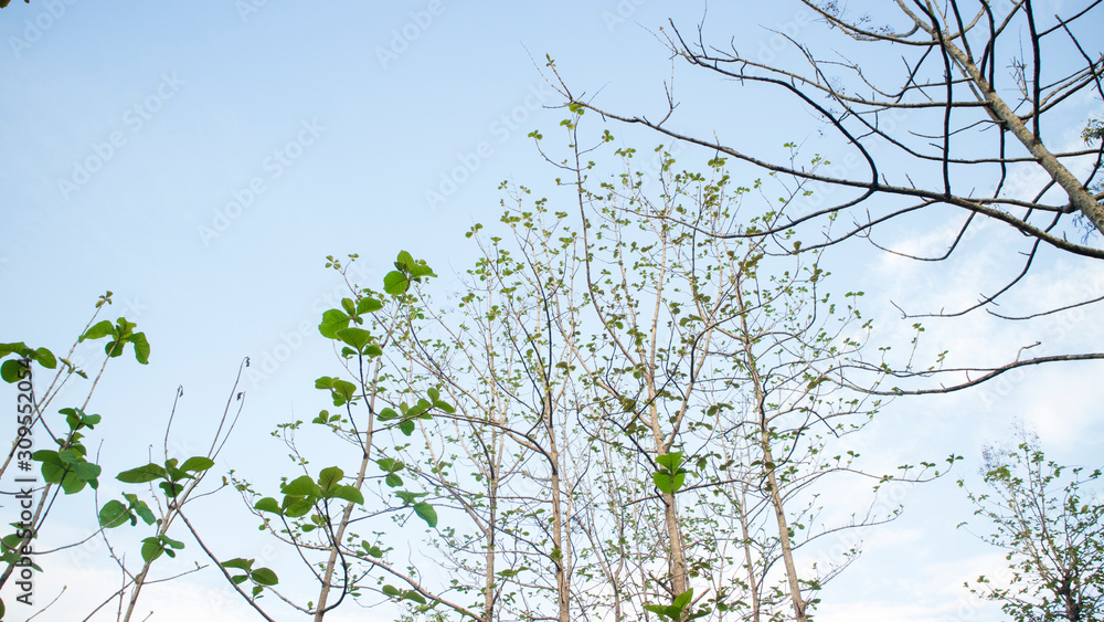 Teak tree shoots enter the rainy season after a long time of falling due to lack of water