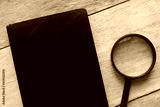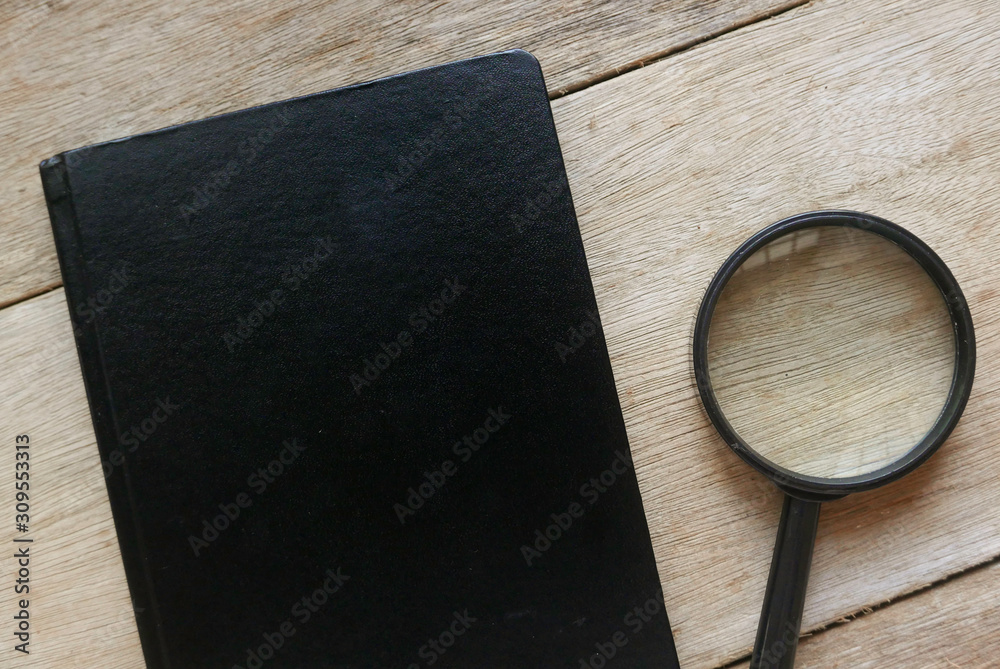 Notebook with stationery on wooden background. Copy space for text or logo.