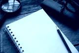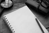 Notebook with stationery on wooden background. Copy space for text or logo.