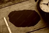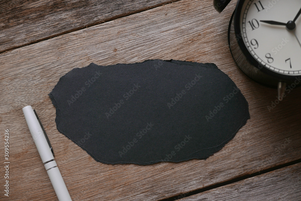 Top view of a clock,pen and blank a piece of black paper on wooden background. Copy space.