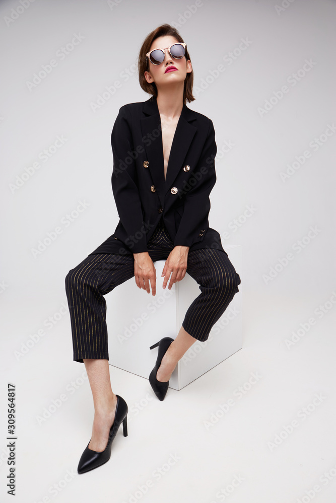 High fashion portrait of young elegant woman. Sunglasses, black jacket, pants.