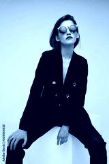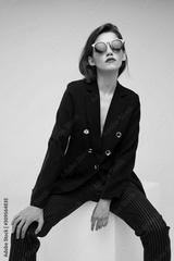 High fashion portrait of young elegant woman. Sunglasses, black jacket, pants.
