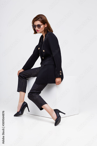 High fashion portrait of young elegant woman. Sunglasses, black jacket, pants.
