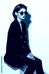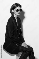 High fashion portrait of young elegant woman. Sunglasses, black jacket, pants.