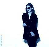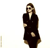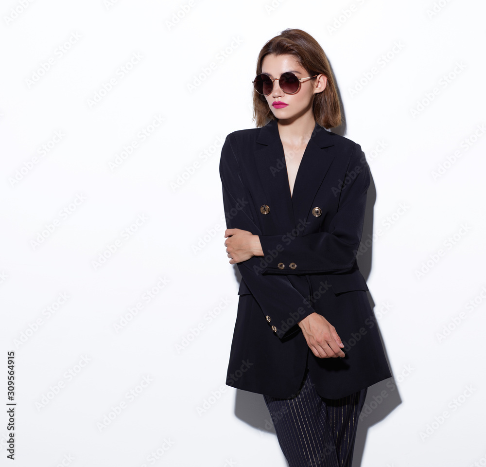 High fashion portrait of young elegant woman. Sunglasses, black jacket, pants.