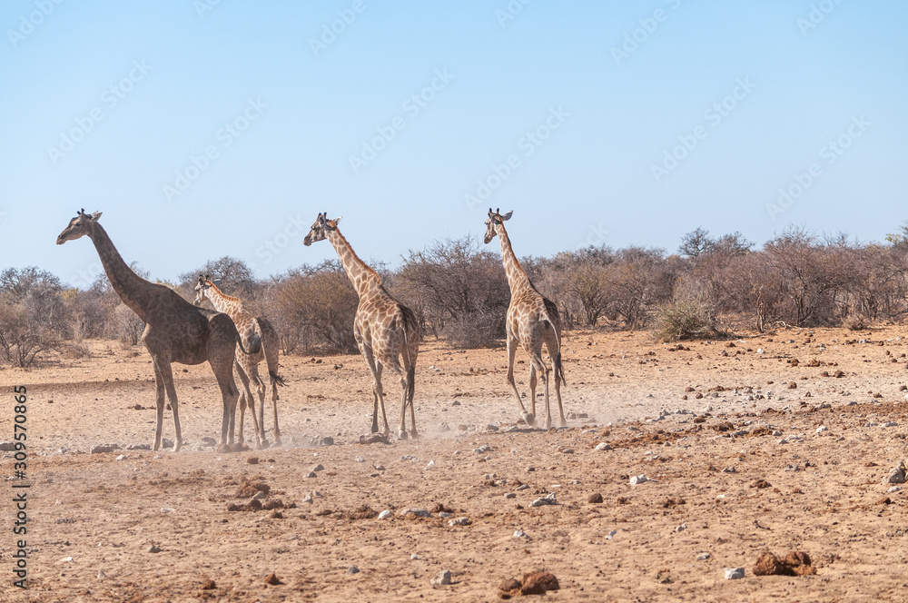 Four Angolan Giraffes - Giraffa giraffa angolensis walking nervously around a waterhole in Etosha national park, Namibia.