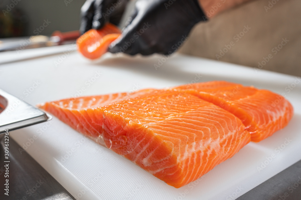 Salmon fillet on a white Board cut into large pieces by a black-gloved cook.