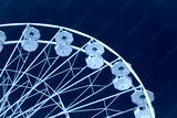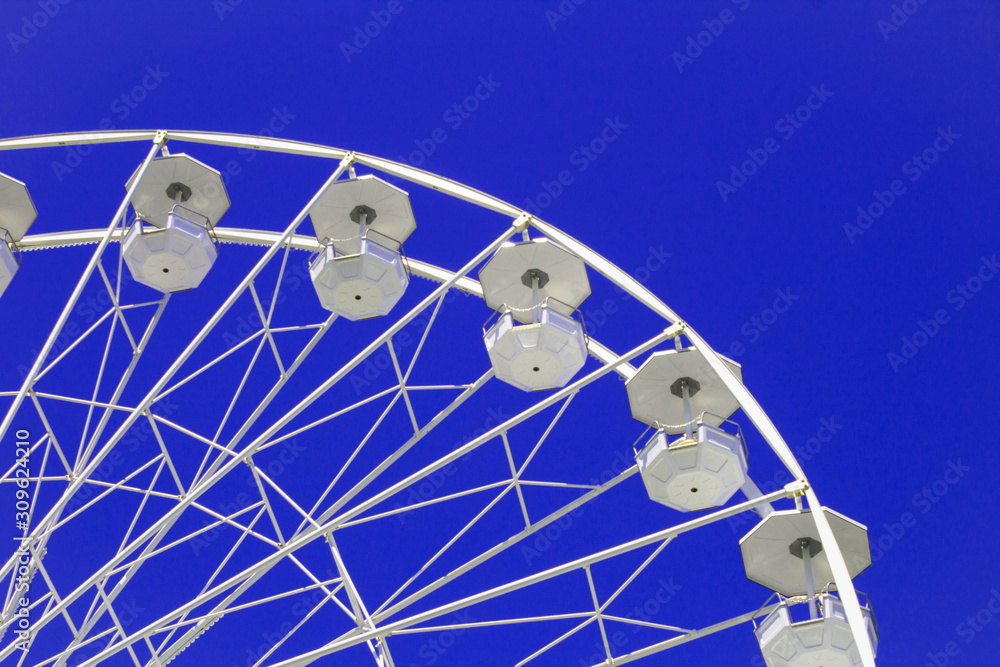 White ferris wheel on the bright blue sky. Copy space. Closeup.