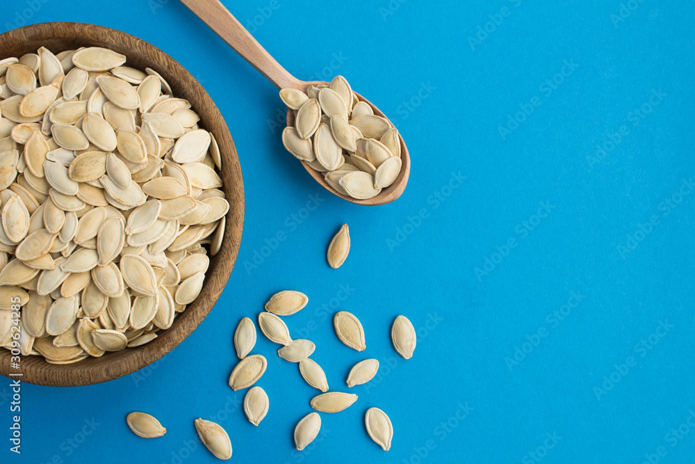 Pumpkin seeds in the brown bowl and spoon on the blue background. Copy space. Top view.