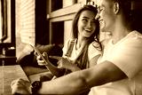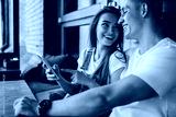 Happy couple in love enjoying live communication during online chatting with followers from share blog web page, cheerful Caucasian marriage discussing content text from publication on cellular