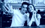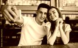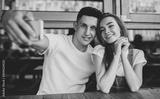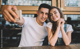 Portrait of cheerful Caucasian marriage in casual wear embracing each other in street cafeteria and smiling at camera while clicking selfie pictures via modern cellphone gadget,concept of relationship