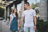 Positive male and female hipster guys holding each other on hands and walking around urban setting in city area,happy couple in love enjoying free time and summer vacations for flirting and recreating