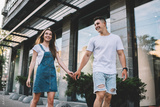 Positive male and female lovers holding each other on hands and walking around urban setting in city area, happy couple in love enjoying free time and summer vacations for flirting and recreating