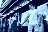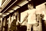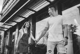 Cheerful couple in love rejoicing during journey travel for exploring new city and urban setting, positive Caucasian man and woman in trendy wear walking during date for flirting at urban setting