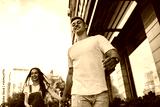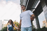 Below view of happy hipster guy dressed in casual wear holding hand of cheerful girlfriend and exploring city area togetherness, positive male and female walking and laughing feeling good from getaway