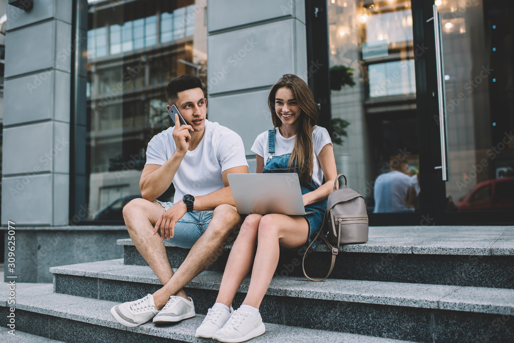 Portrait of happy hipster girl in trendy apparel sitting at urban setting and smiling at camera while lovely boyfriend receiving international smartphone conversation, concept of roaming communication