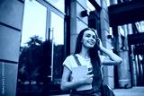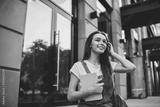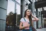Positive female reader with knowledge textbook looking away and smiling during leisure time for literature hobby, cheerful Caucasian woman with best seller in hand enjoing free time at city area