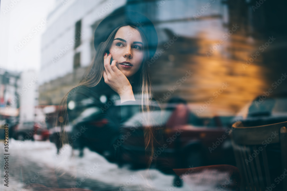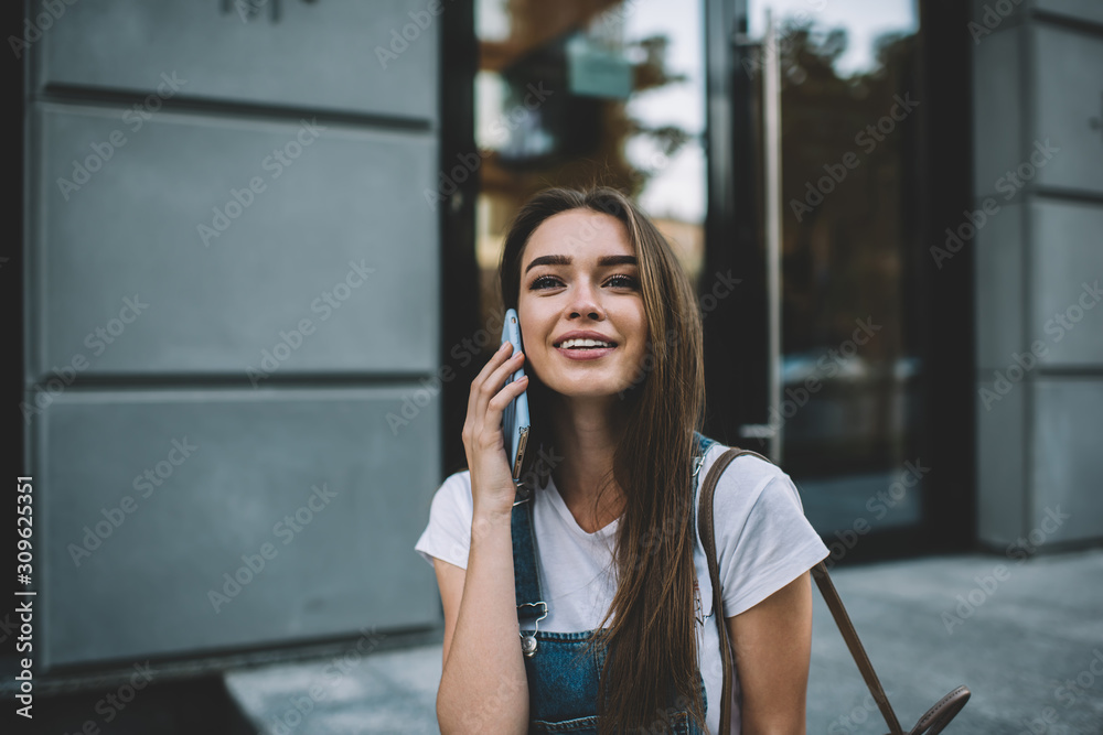 Positive female using international roaming connection for communicate with best friend via cellphone application, happy hipster girl calling via cellular gadget and smiling during mobile conversation
