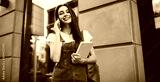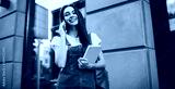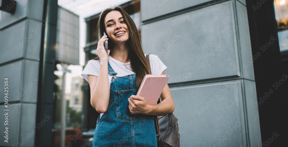 cheerful hipster girl in casual jeans apparel smiling at camera during friendly smartphone conversation via app, happy female student standing at street and phoning via cellular