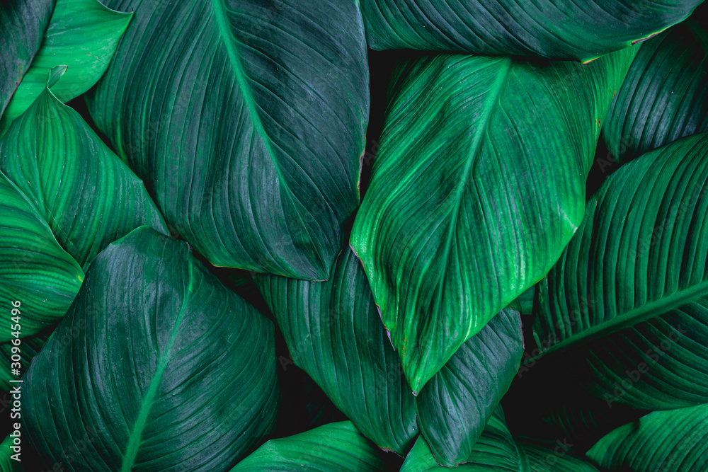 leaves of Spathiphyllum cannifolium, abstract green texture, nature background, tropical leaf