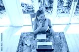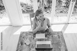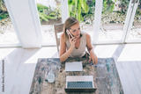 Attentive female sitting at table and talking on mobile