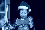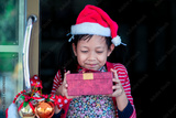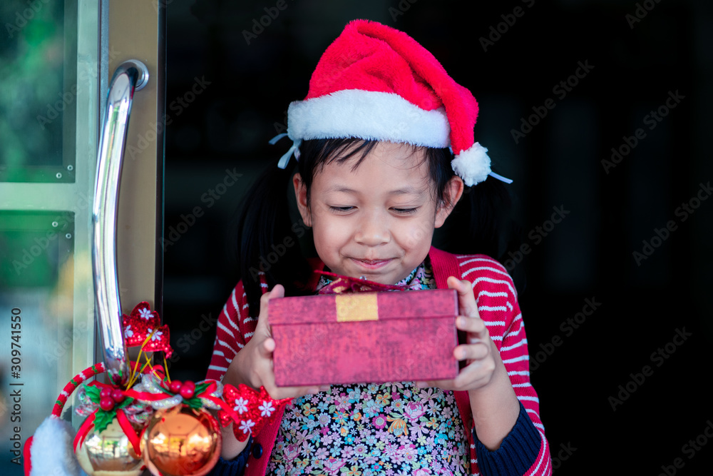 Asian smiling beautiful girl holding a gift box behind door at home.Christmas or X-mas concept