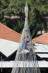 A workman high up inside a tall Christmas tree made from a metal frame with lights works on the installation.