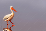 Wild african birds. One large pink pelican and its reflection in the clear water of the lagoon