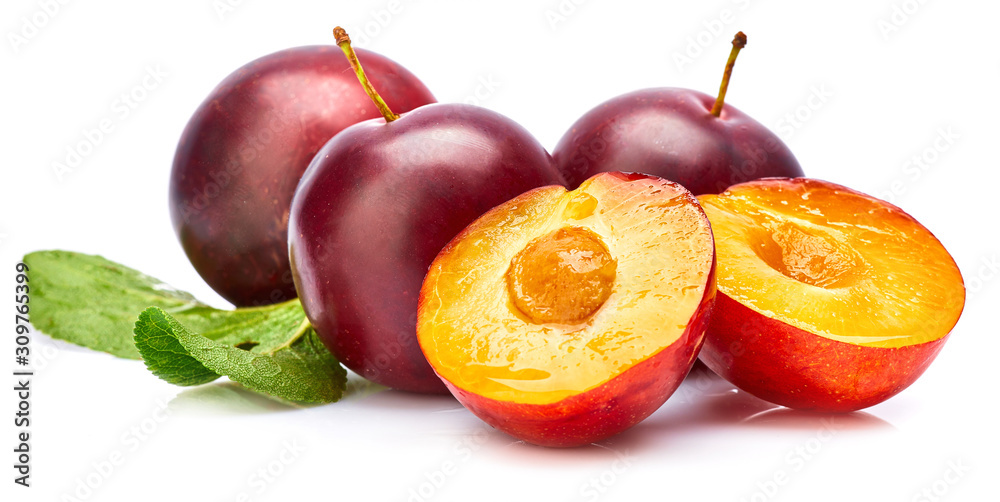 Fresh plum in cut with green leaf. Fruity still life. Healthy food. Isolated on white background.