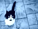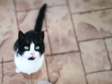 Cat looking up and sitting on the floor with copy space. Black and withe cat.