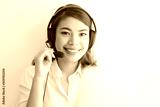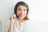 Asian woman on white shirt speak with headphone and using laptop on white background smile and happy face operator concept