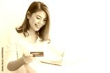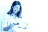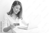 Asian woman using credit card shopping online with laptop computer on white background