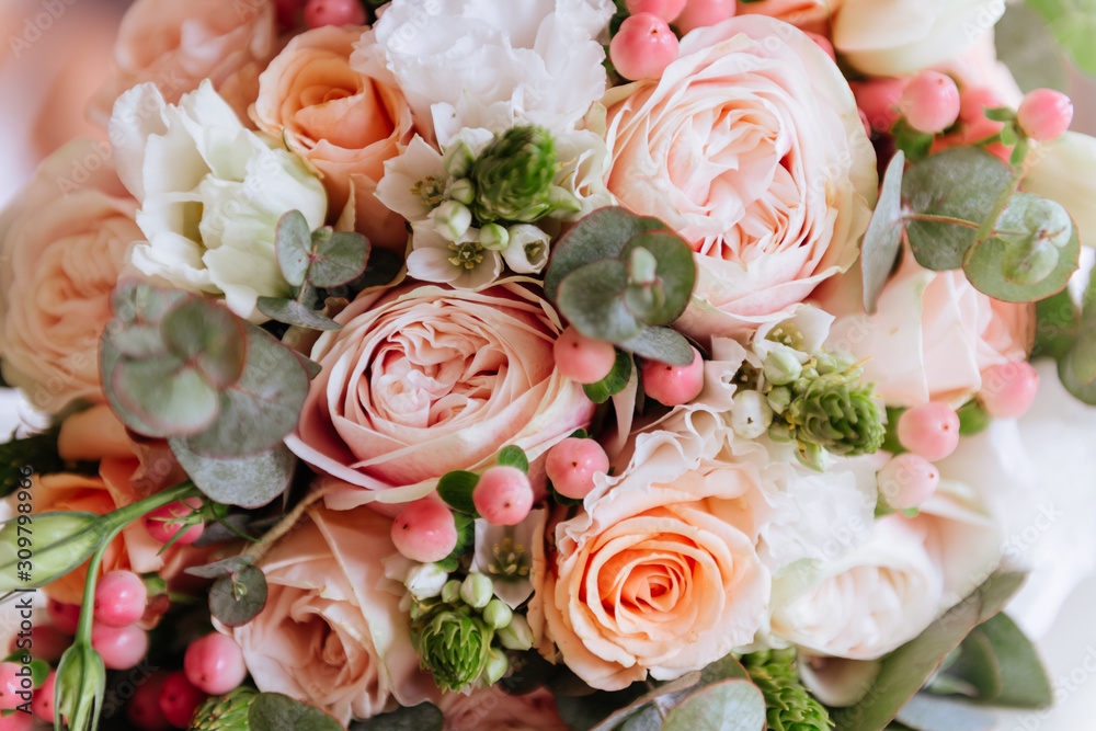 Wedding flowers, bridal bouquet closeup. Decoration made of roses, peonies and decorative plants