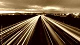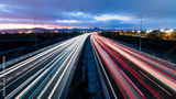 Highway at sunset, vehicles driving in two directions leaving trails of light