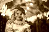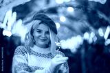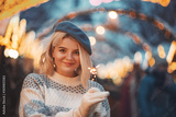 Outdoor night portrait of young happy smiling blonde girl holding sparkler, posing at festive Christmas street market in European city. Celebration, winter holidays concept. Copy, empty space