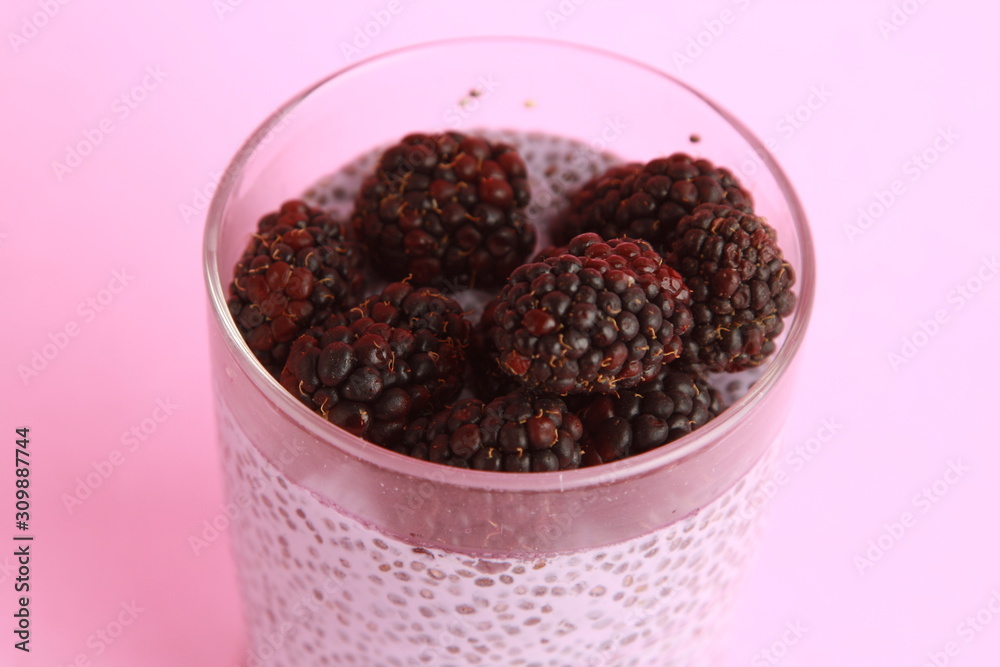 glass of chia pudding with blackberry flavor