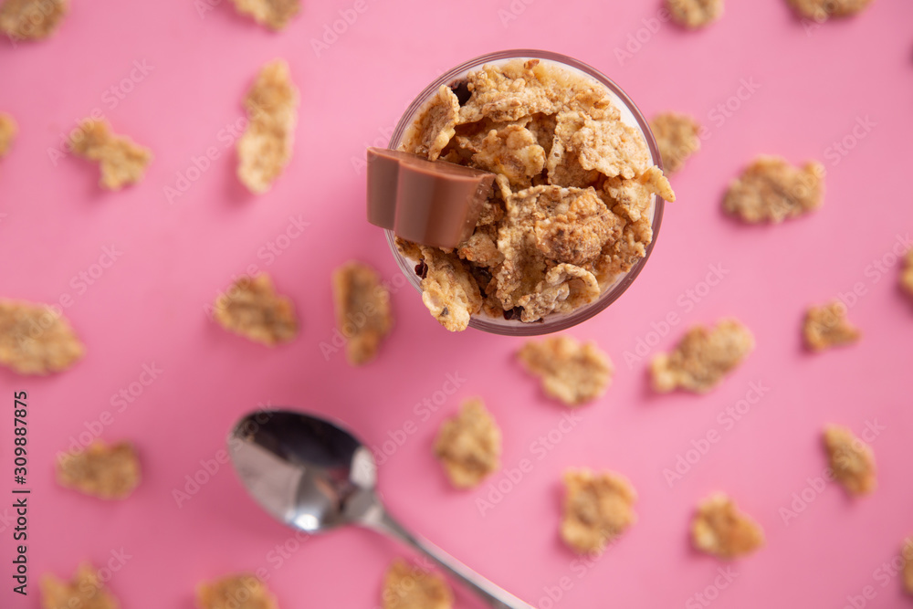 Delicious breakfast, cocoa chia pudding with yogurt and cereals