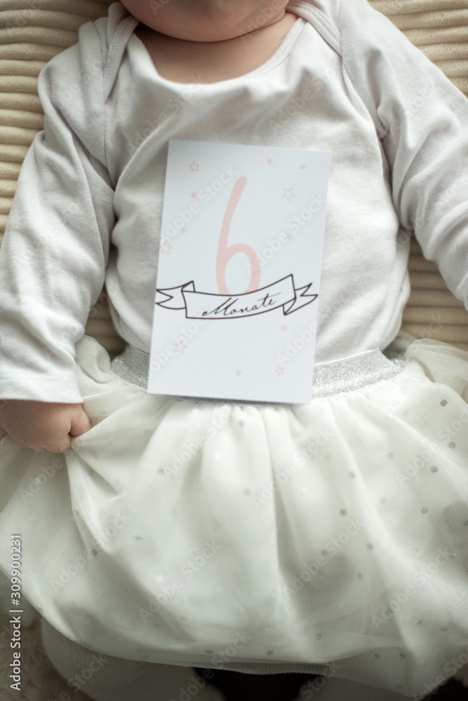 Baby Mädchen 6 Monate alt i weißem Glitzer Tüll Rock mit Meilensteinkarte mit der Aufschrift "6 Monate"