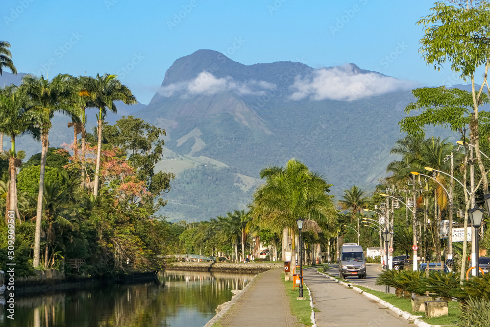 View from promenade with trees of river Perequê-Açu to the majestic Atlantic forest mountains in background, Paraty, Brazil
