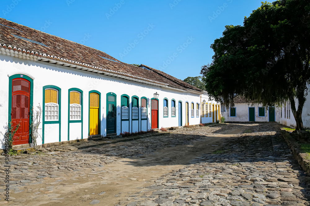 Typical house facades with colorful doors and windows, tree in foreground, sunny day, in historic town Paraty, Brazil, Unesco World Heritage